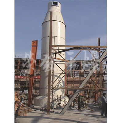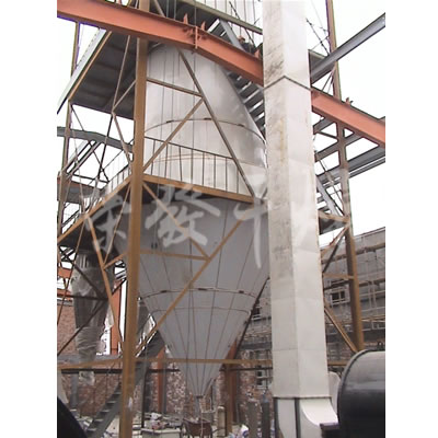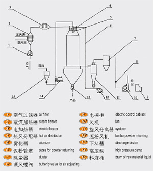 本機(jī)組工作過程為料液通過隔膜泵高壓輸入,噴出霧狀液滴,然后同熱空氣并流下降,大部分粉粒由塔底排料口收集,廢氣及其微小粉末經(jīng)旋風(fēng)分離器分離,廢氣由抽風(fēng)機(jī)排出,粉末由設(shè)在旋風(fēng)分離器下端的授粉筒收集,風(fēng)機(jī)出口還可裝備二級(jí)除塵裝置,回收率在96-98%以上。
