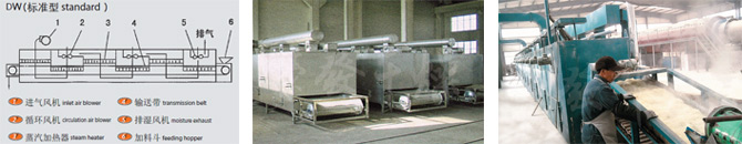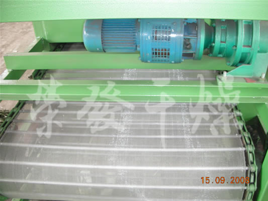 物料由加料器均勻地鋪在網(wǎng)帶上,網(wǎng)帶一般采用12-60目不銹鋼絲網(wǎng),由傳動裝置拖動在干燥機(jī)內(nèi)移動。干燥機(jī)由若干單元組成,每一單元熱風(fēng)獨立循環(huán),部分尾氣由專門排濕風(fēng)機(jī)排出,廢氣由調(diào)節(jié)閥控制,熱氣由下往上或由上往下穿過鋪滿物料的網(wǎng)帶完成熱量與質(zhì)量傳遞的進(jìn)程,帶走物料水份。網(wǎng)帶緩慢移動,運行速度可根據(jù)物料溫度自由調(diào)節(jié),干燥后的成品連續(xù)落入收料器中。上下循環(huán)單元根據(jù)用戶需要可靈活配備,單元數(shù)量亦可根據(jù)需要選取。