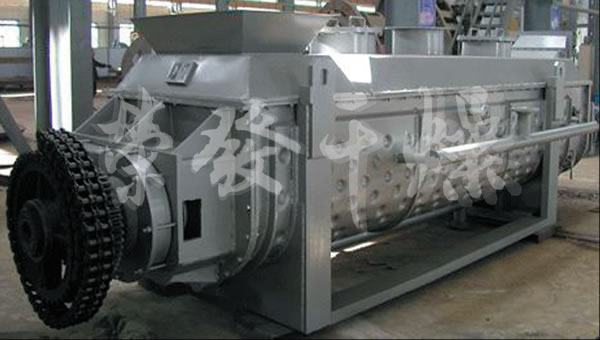 空心軸上密集排列著楔型中空漿葉,熱介質經空心軸流經漿葉。單位有效容積內傳熱面積很大,熱介質溫度從-40℃到320℃,可以是水蒸汽,也可以是液體型:如熱水、導熱油等。間接傳導加熱,沒有攜帶空氣帶走熱量,熱量均用來加熱物料。熱量損失僅為通過器體保溫層向環境的散熱。楔型漿葉傳熱面具有自清潔功能。物料顆粒與楔型面的相對運動產生洗刷作用,能夠洗刷掉楔型面上附著物料,使運轉中一直保持著清潔的傳熱面。漿葉干燥機的殼體為Ω型,殼體內一般安排二到四根空心攪拌軸。殼體有密封端蓋與上蓋,防止物料粉塵外泄而充分發揮作用。
