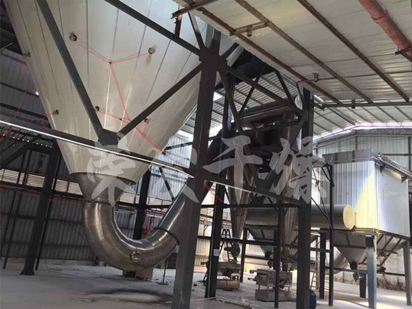 空氣經過濾和加熱,進入干燥器頂部空氣分配器,熱空氣呈螺旋狀均勻地進入干燥室。料液經塔體頂部的高速離心霧化器,(旋轉)噴霧成極細微的霧狀液珠,與熱空氣并流接觸在極短的時間內可干燥為成品。成品連續地由干燥塔底部和旋風分離器中輸出,廢氣由風機排空。